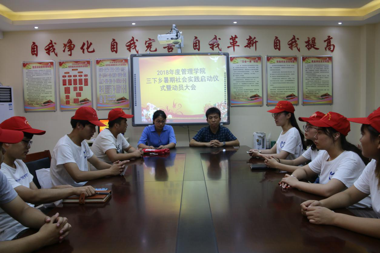 (通讯员:宋志晴)大学生社会实践活动是引导学生走出校门、接触社会、了解国情的重要渠道,是提高思想觉悟、增强服务社会意识、促进大学生健康成长的有效途径。7月6日下午,管理学院2018年度三下乡暑期社会实践启动仪式暨动员大会于八号楼四楼会议室举行。管理学院党总支副书记马斌、团学办指导老师李玲慧及管理学院社会实践团队全体成员参加了此次会议。