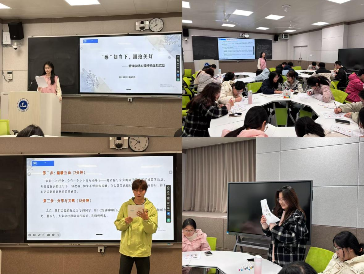 (通讯员 王岩 祁桐进)为响应学校心理健康教育工作号召,帮助学生提升情绪调适与自我关怀能力,管理学院于12月17日晚19:00在8号楼B201教室举办了“感知当下,拥抱美好”心理疗愈体验活动。本次活动通过轻松丰富的觉察训练,引导学生在专注体验中缓解学业压力、提升情感表达与自我觉察能力,营造出温暖包容、相互支持的成长氛围。