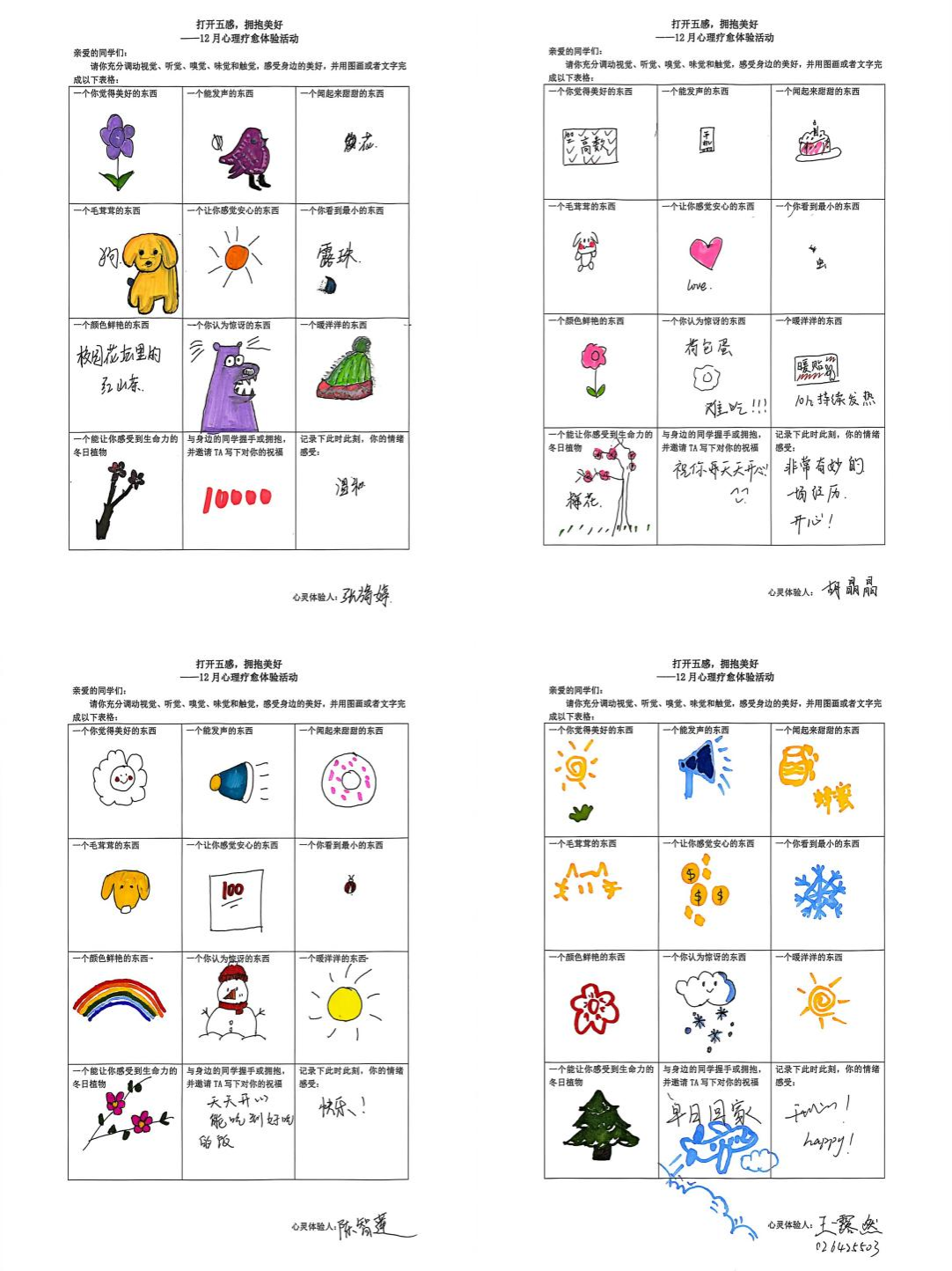 活动围绕“五感探索”主线,设计了三个自然衔接的环节。首先,同学们借助《五感觉察记录表》,从视觉、听觉、嗅觉、触觉和心理感受五个维度,记录或描绘日常生活中那些被忽略的美好细节。例如冬日校园里的一抹绿意、笔尖划过纸面的沙沙声、记忆中的桂花香气、手心握着的水杯传来的温度等,在专注而安静的书写与描绘中,同学们完成了一次对生活的温柔回溯与情感整理。随后的“温暖互动”环节,同学们通过握手、微笑彼此致意,并在对方的记录表上写下真挚的祝福,在互动中传递温暖与支持。最后的“分享与共鸣”阶段,多位同学主动分享了参与活动的感受与发现,真诚的表达引发了现场广泛共鸣。整场活动始终秉持尊重自主、呵护心理安全感的原则,不设强制发言,鼓励专注倾听,让交流在自然、轻松的氛围中流动。